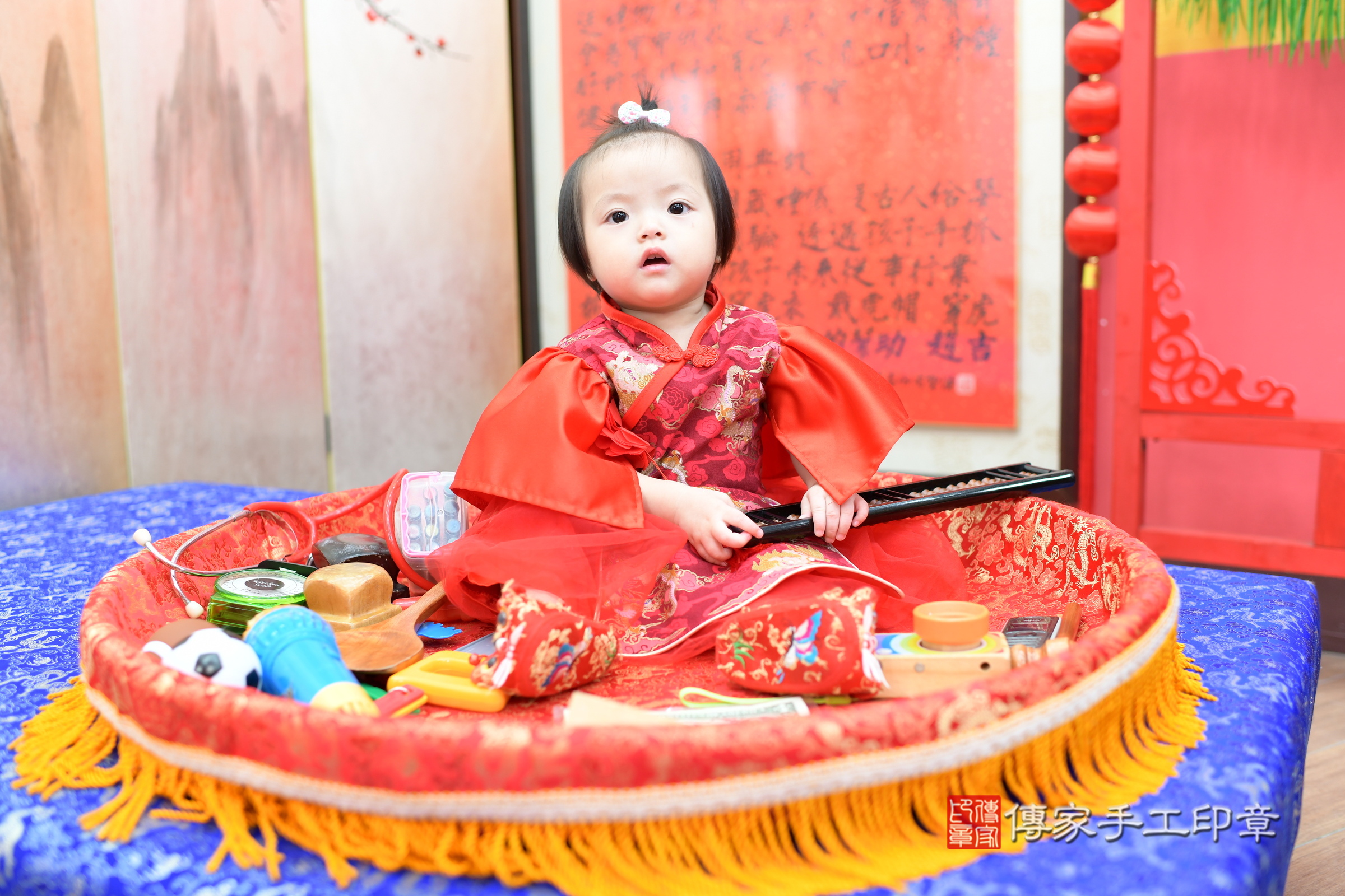 新北市永和區蘇寶寶抓周推薦:傳家新北店抓周度脺中國風會場,嬰兒古禮抓周流程儀式吉祥話、抓周道具物品24種、拍照。抓周證書。2023.11.5