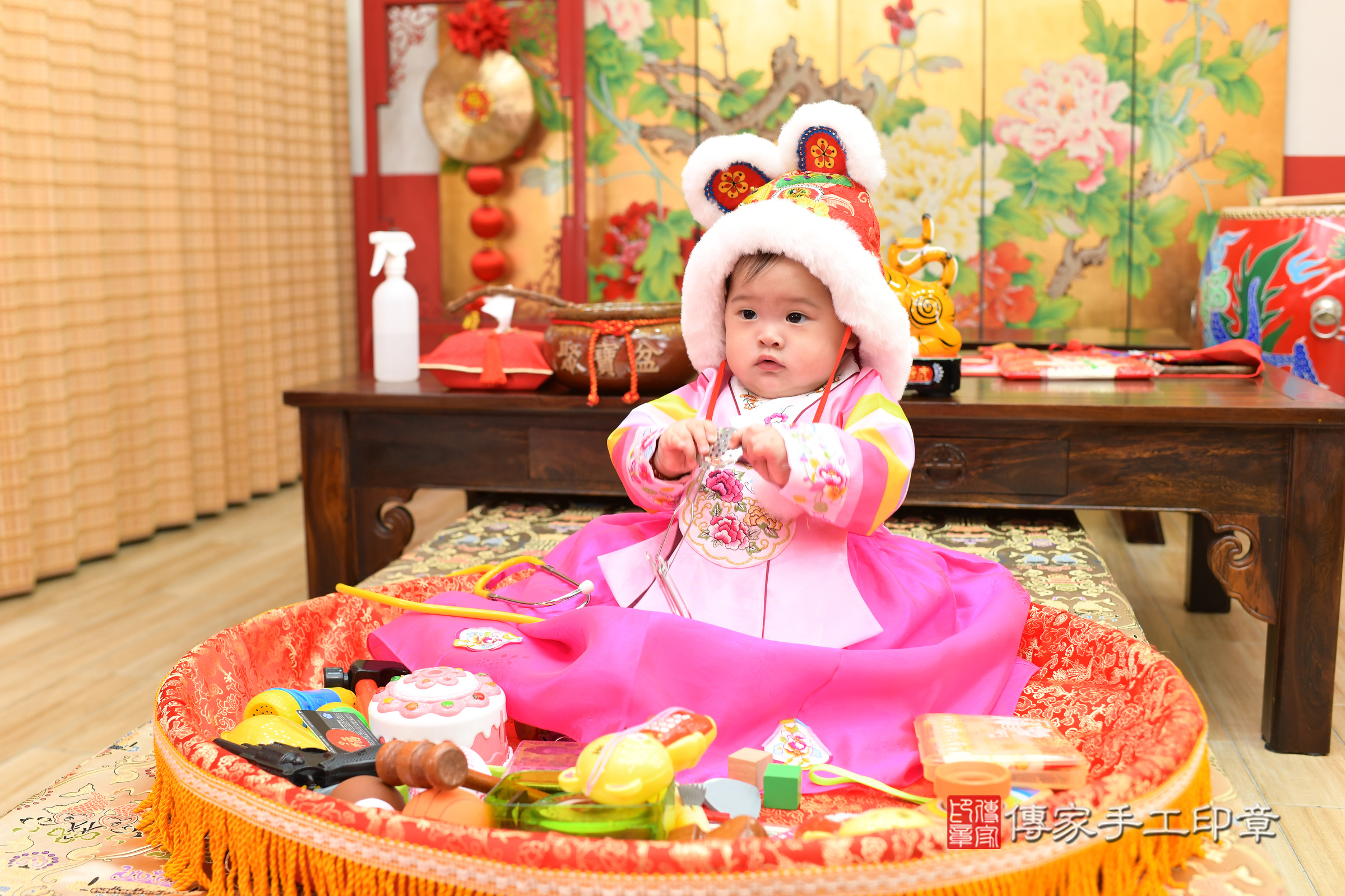 台北市大同區羅寶寶抓周推薦:傳家台北店抓周度脺中國風會場,嬰兒古禮抓周流程儀式吉祥話、抓周道具物品24種、拍照。抓周證書。2023.12.15