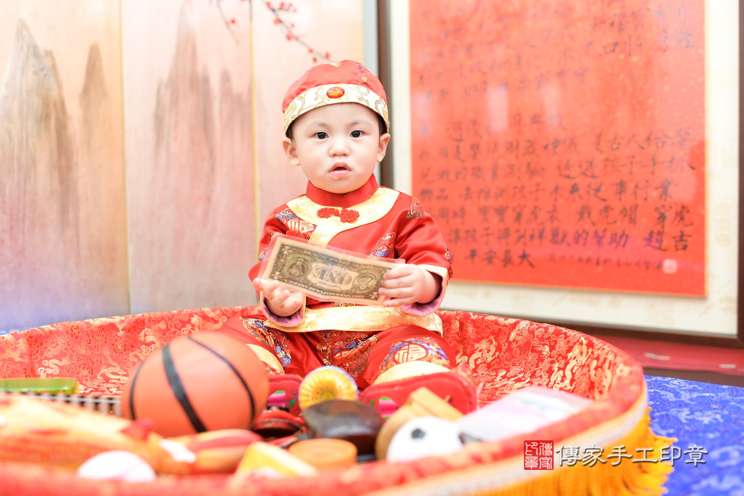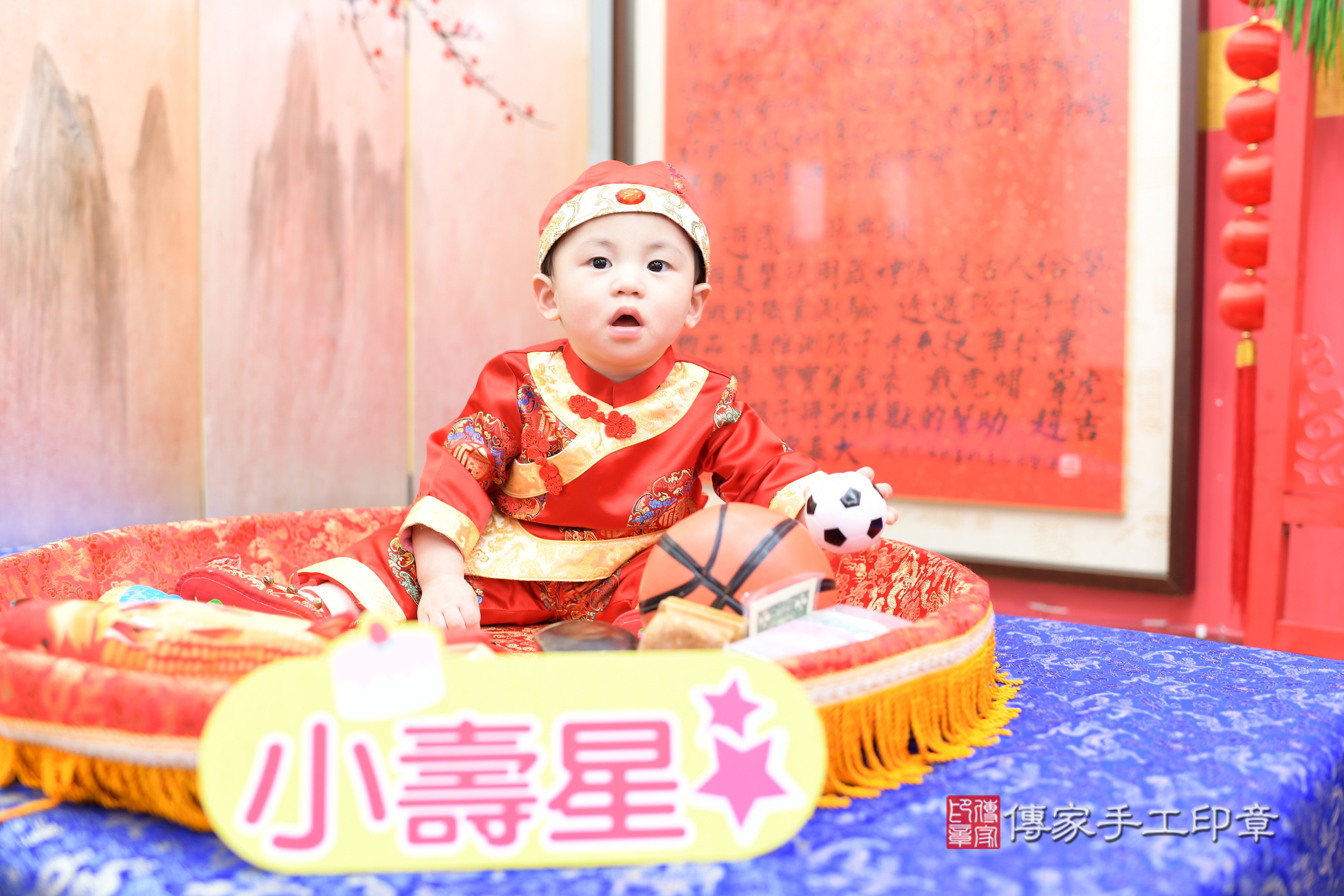 新北市永和區陳寶寶抓周推薦:傳家新北店抓周度脺中國風會場,嬰兒古禮抓周流程儀式吉祥話、抓周道具物品24種、拍照。抓周證書。2024.2.1