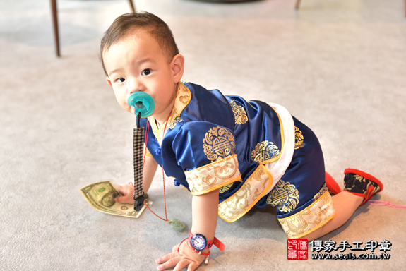 抓周儀式楠梓區林寶寶【抱蒜】:讓寶寶精打細算。