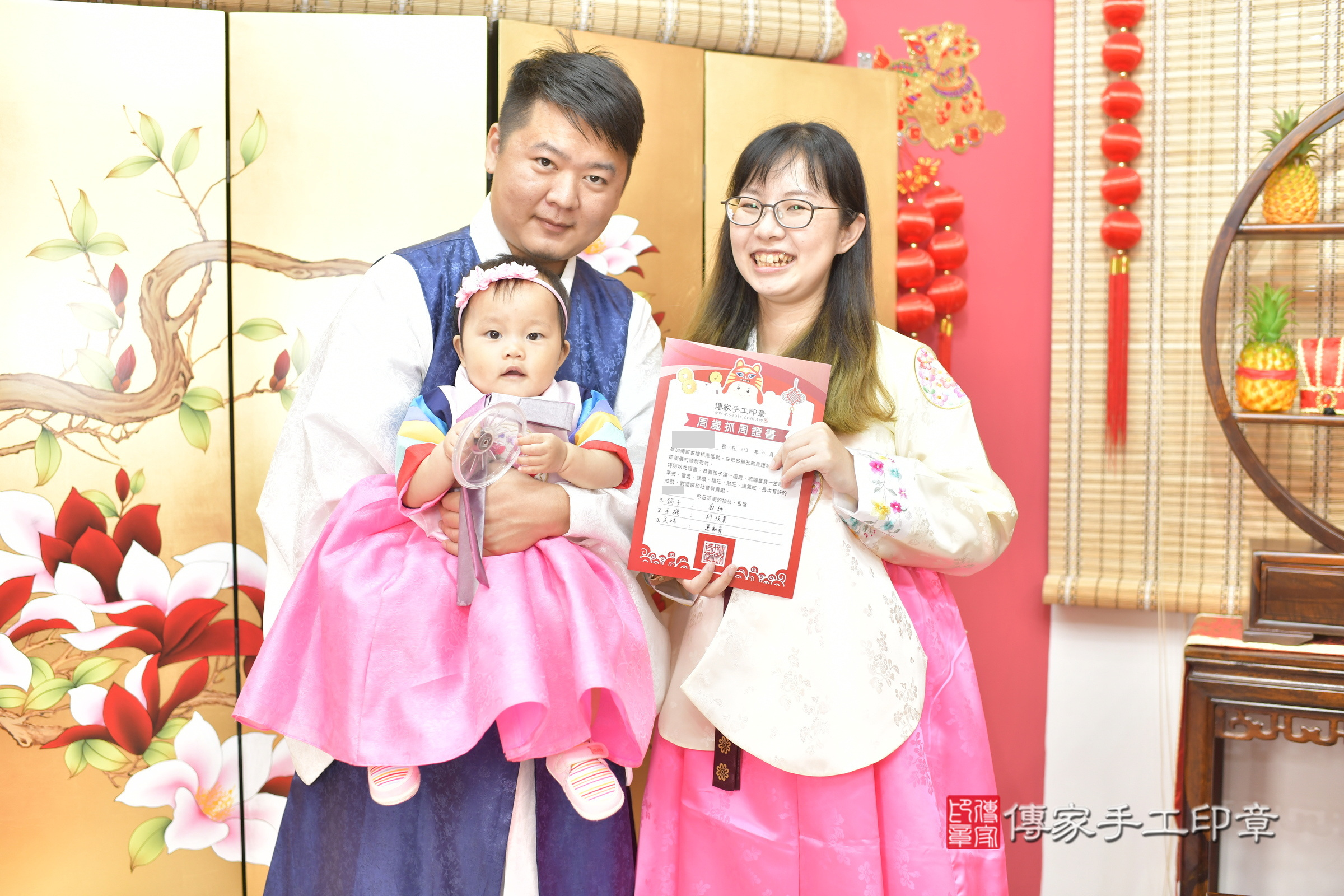 幸福的一家人在這個好日子完成了這場傳統的抓周儀式,