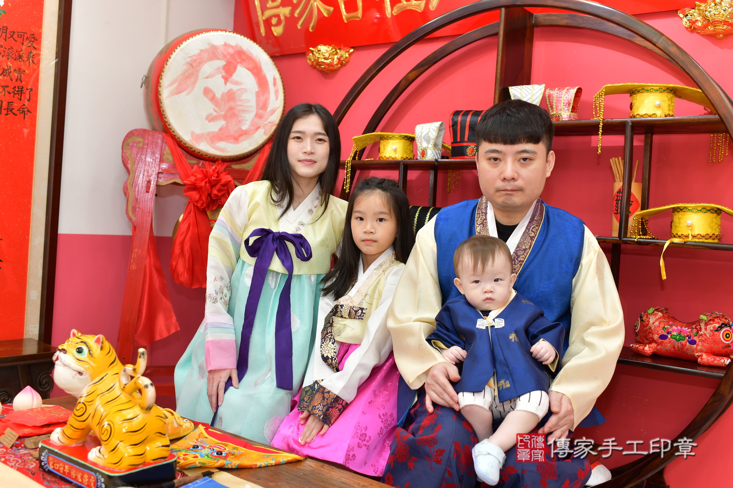 幸福的一家人在這個好日子完成了這場傳統的抓周儀式,