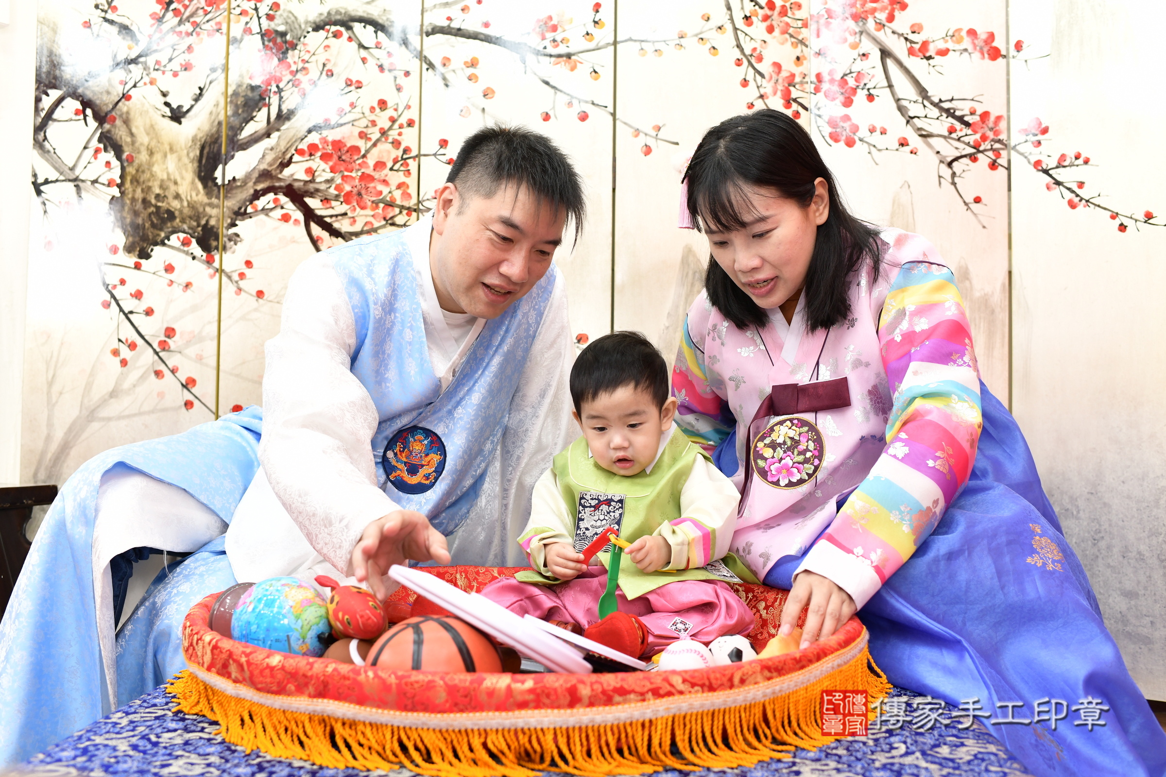 幸福的一家人在這個好日子完成了這場傳統的抓周儀式,