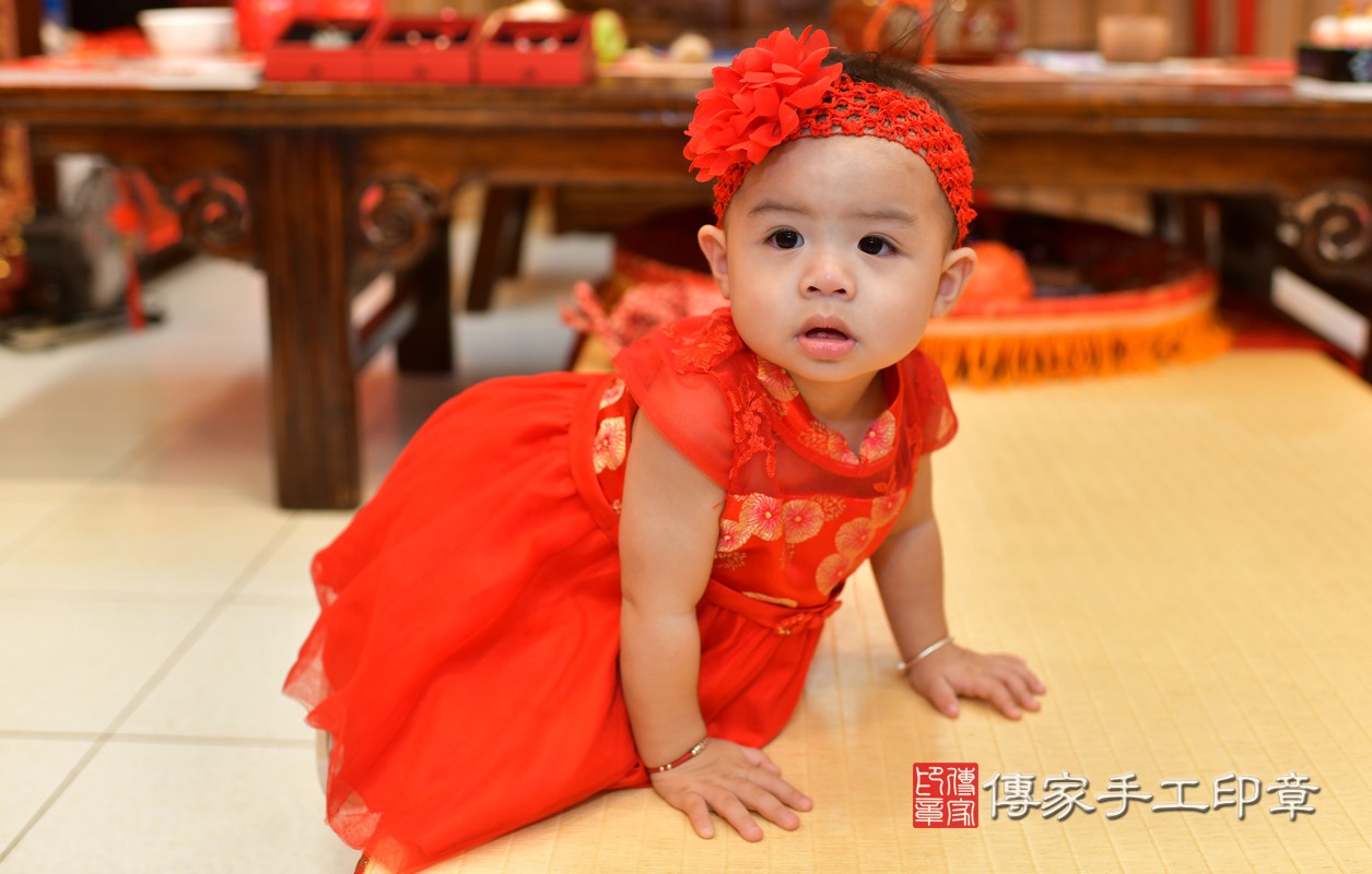 鳳山區董寶寶抓周儀式【度晬歌、(腳踩紅龜糕)】朗誦祝福:古禮祝福寶寶健康平安長大。腳踩紅龜糕的儀式,是台灣古禮抓周的重要儀式之一。高雄店抓周。