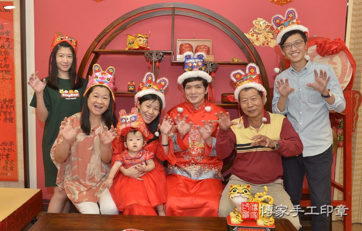 永和區周寶寶抓周儀式【福虎歌】朗誦祝福:虎爺保佑寶寶吉祥,趨吉避凶。在中國和台灣,虎爺是兒童的守護神,週歲有虎爺保佑,可以象徵吉祥平安。新北店抓周。