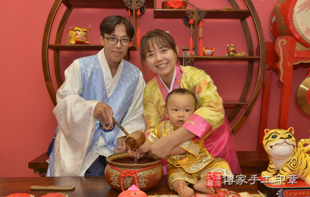 永和區魏寶寶抓周淨手儀式:抓周儀式寶寶淨手象徵洗淨,把不好的去掉,洗滌身心靈。新北店抓周。