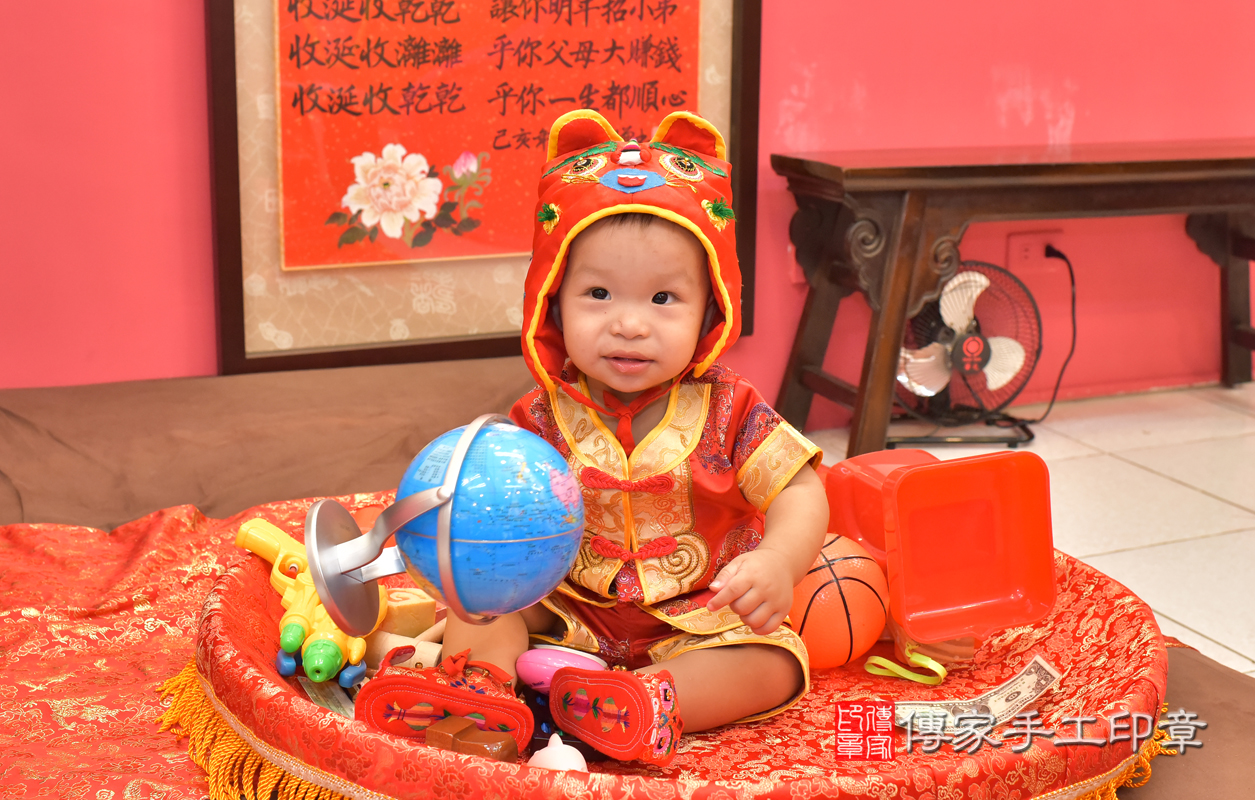 台中市北區洪寶寶古禮抓周【穿抓周虎衣、帶抓周虎帽、穿抓周虎鞋】:滿週歲趨吉避凶的吉祥衣服穿戴。台中店抓周。