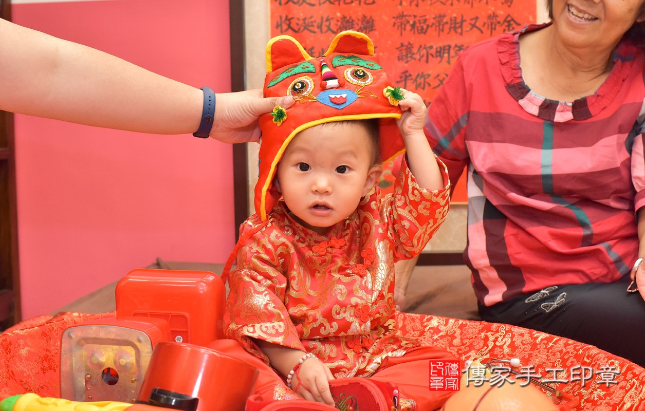 台中市北區翁寶寶古禮抓周【穿抓周虎衣、帶抓周虎帽、穿抓周虎鞋】:滿週歲趨吉避凶的吉祥衣服穿戴。台中店抓周。