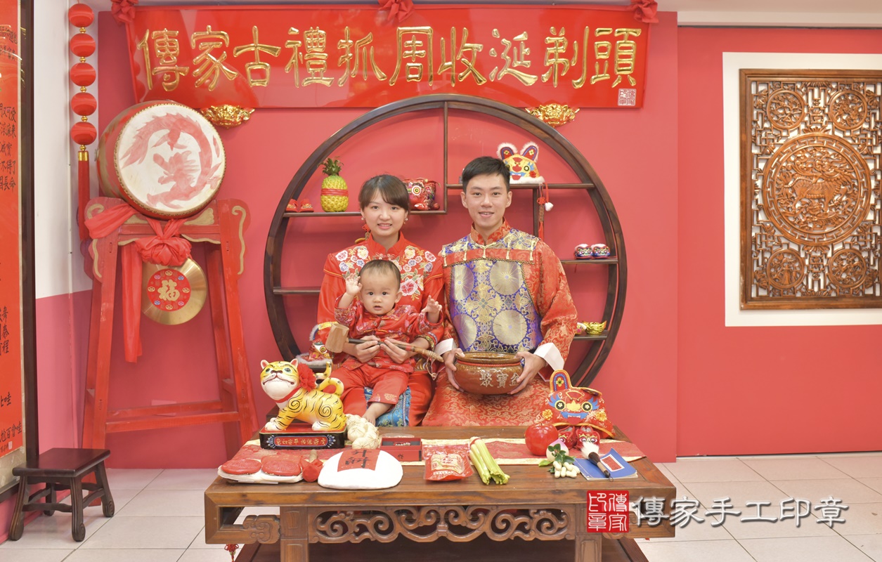 台中市北區黃寶寶抓周推薦:傳家台中店抓周度脺中國風會場,嬰兒古禮抓周流程儀式吉祥話、抓周道具物品24種、拍照。抓周證書。2020.12.07