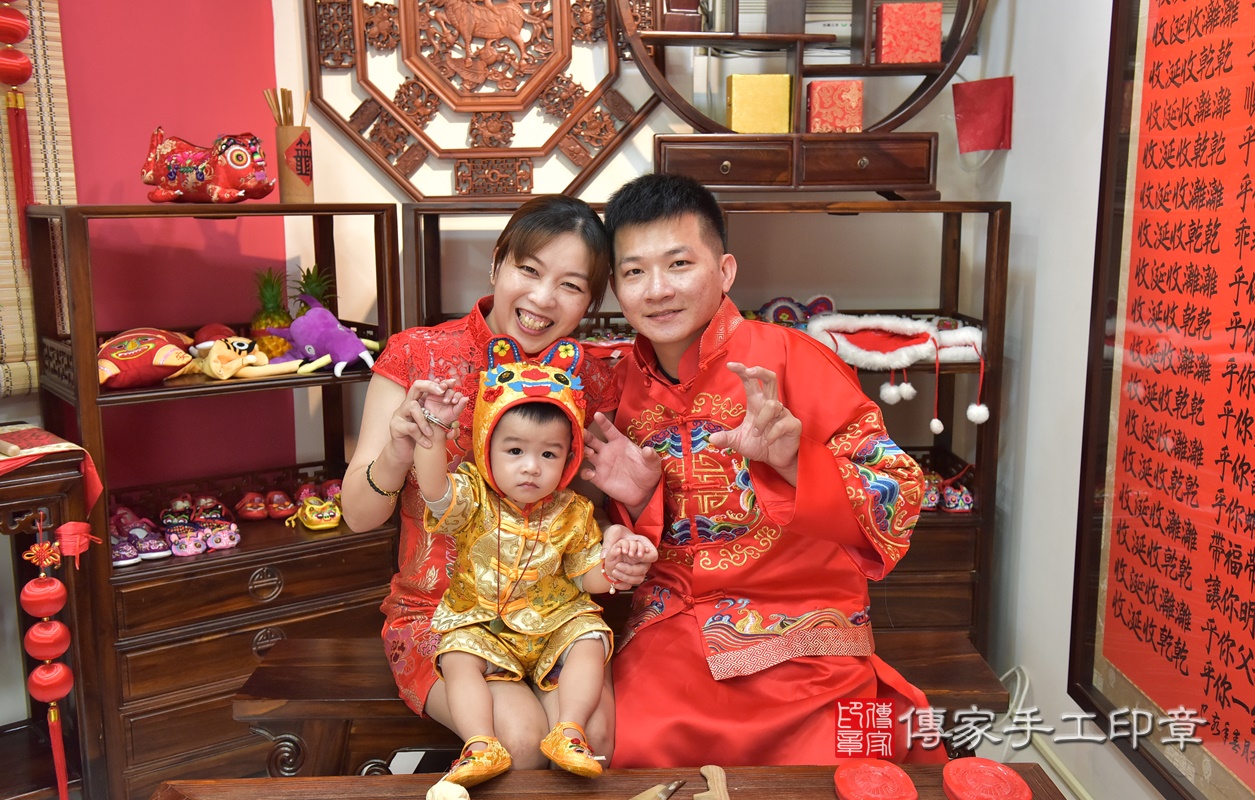 新竹市香山區鄧寶寶古禮抓周【穿抓周虎衣、帶抓周虎帽、穿抓周虎鞋】:滿週歲趨吉避凶的吉祥衣服穿戴。新竹店抓周。