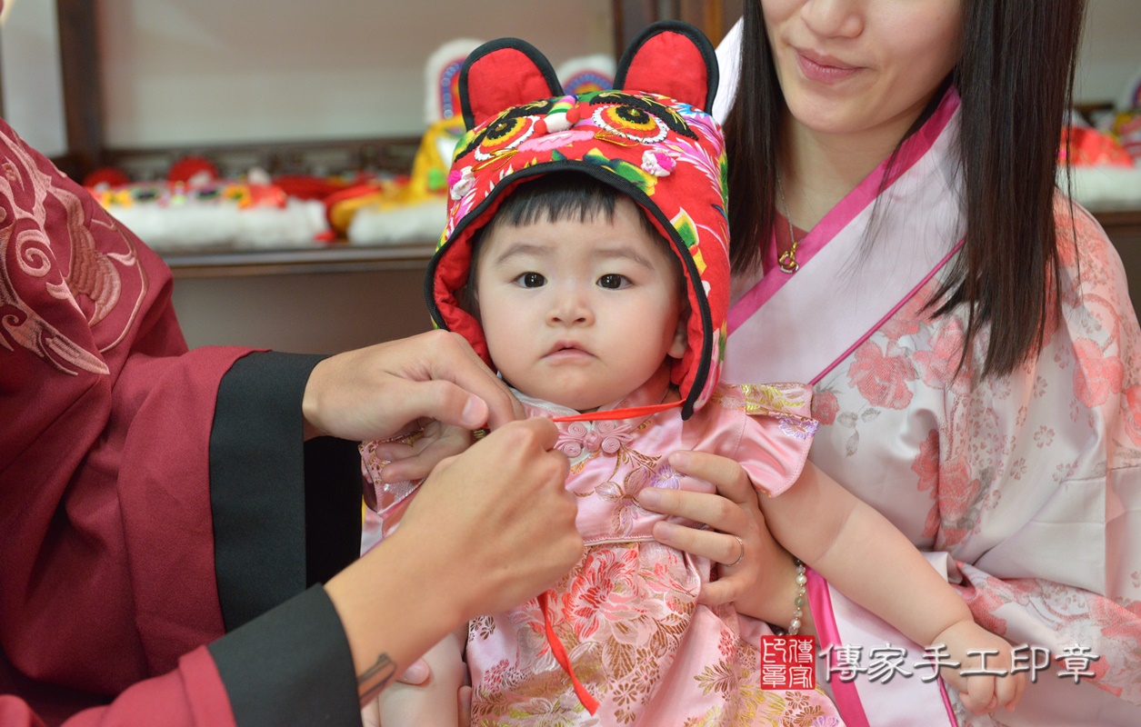 新竹市香山區鄭寶寶古禮抓周【穿抓周虎衣、帶抓周虎帽、穿抓周虎鞋】:滿週歲趨吉避凶的吉祥衣服穿戴。新竹店抓周。