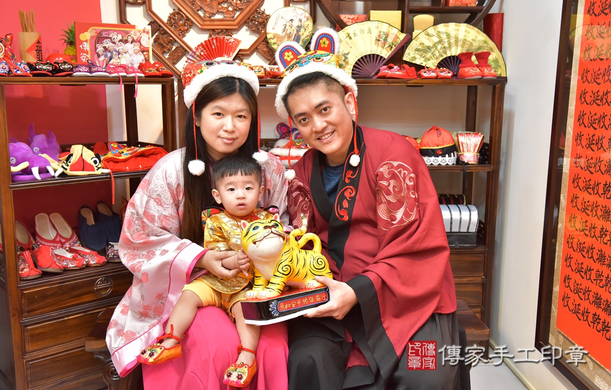 新竹市香山區郭寶寶古禮抓周【穿抓周虎衣、帶抓周虎帽、穿抓周虎鞋】:滿週歲趨吉避凶的吉祥衣服穿戴。新竹店抓周。