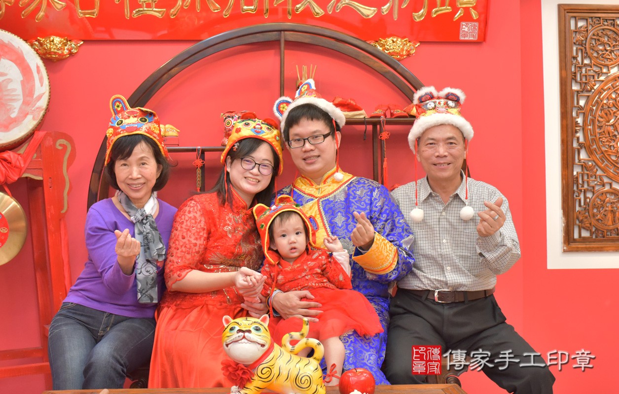 台中市北區謝寶寶古禮抓周【穿抓周虎衣、帶抓周虎帽、穿抓周虎鞋】:滿週歲趨吉避凶的吉祥衣服穿戴。台中店抓周。