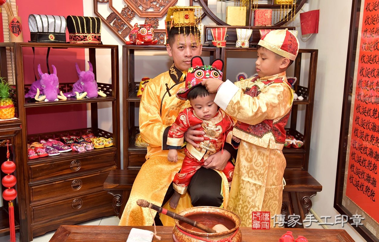 新竹市香山區柯寶寶古禮抓周【穿抓周虎衣、帶抓周虎帽、穿抓周虎鞋】:滿週歲趨吉避凶的吉祥衣服穿戴。新竹店抓周。